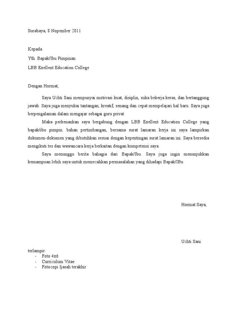 Dulu, surat lamaran kerja memang selalu dikirimkan lewat pos atau diantar langsung ke perusahaan/kantor. Contoh surat lamaran kerja yang berformat doc dan juga pdf bisa dikirimkan lewat email seperti surat lamaran kerja guru, bank ataupun bahasa inggris. Pictures gallery of contoh surat perjanjian les privat. Contoh surat lamaran kerja di pt sebagai karyawan (doc). Dimana cv ini merupakan daftar riwayat hidup, yang isinya perjalanan hidup seseorang.